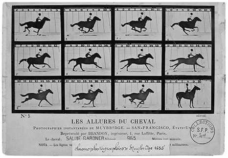 Les allures du cheval Sallie Gardner. Vitesse : 965 mètres par minute, 1878, épreuve sur papier albuminé d’après 12 négatifs sur verre au collodion